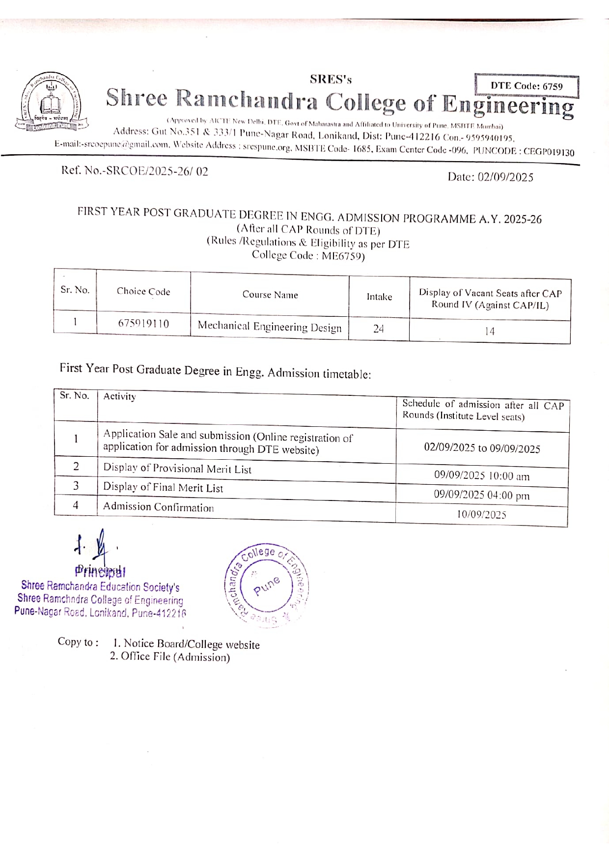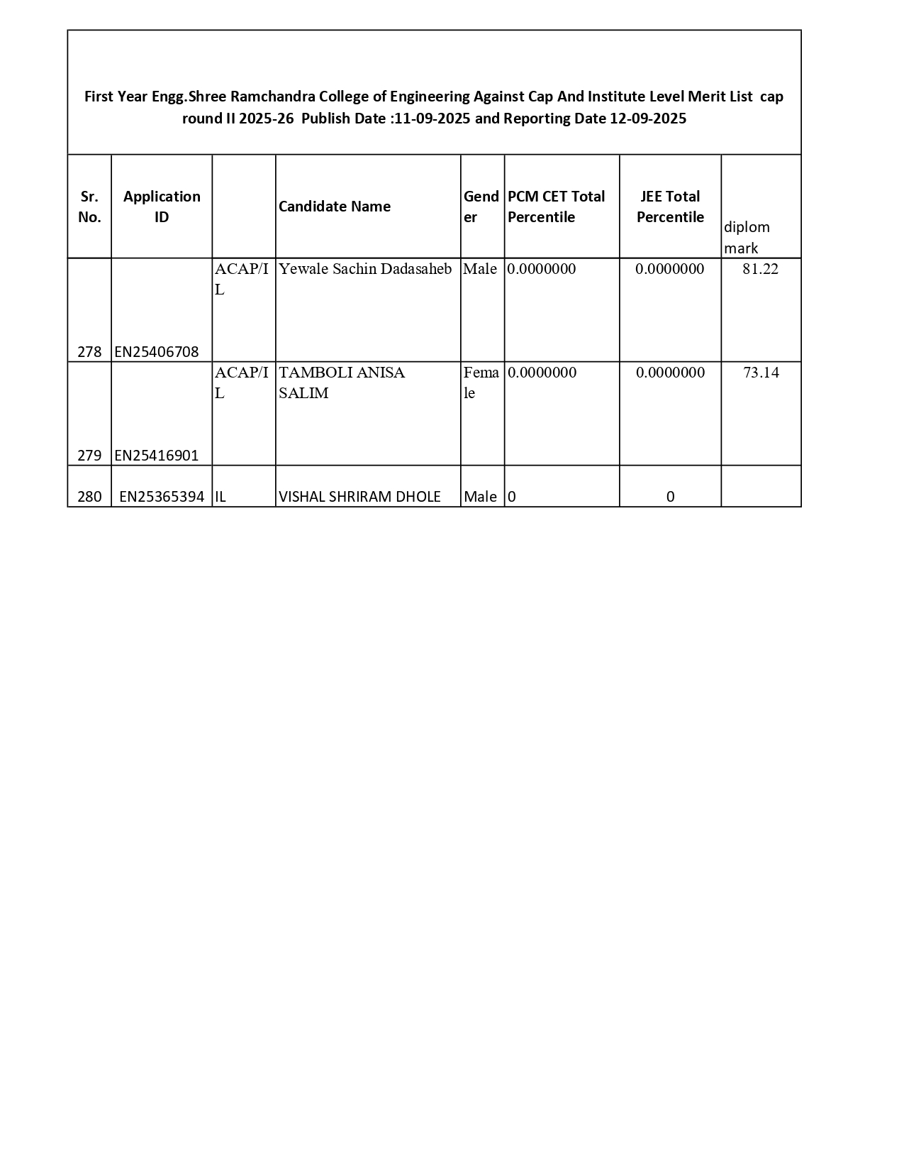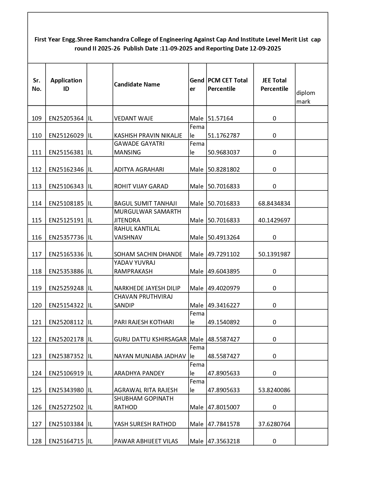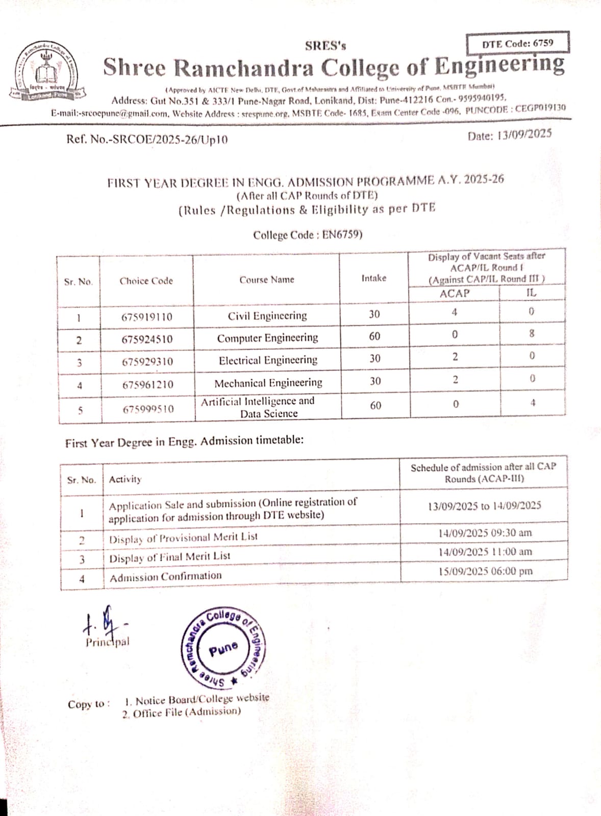 First Year Diploma/Direct Second Year Diploma/First year Engineering/Direct Second Year Engineering and ME