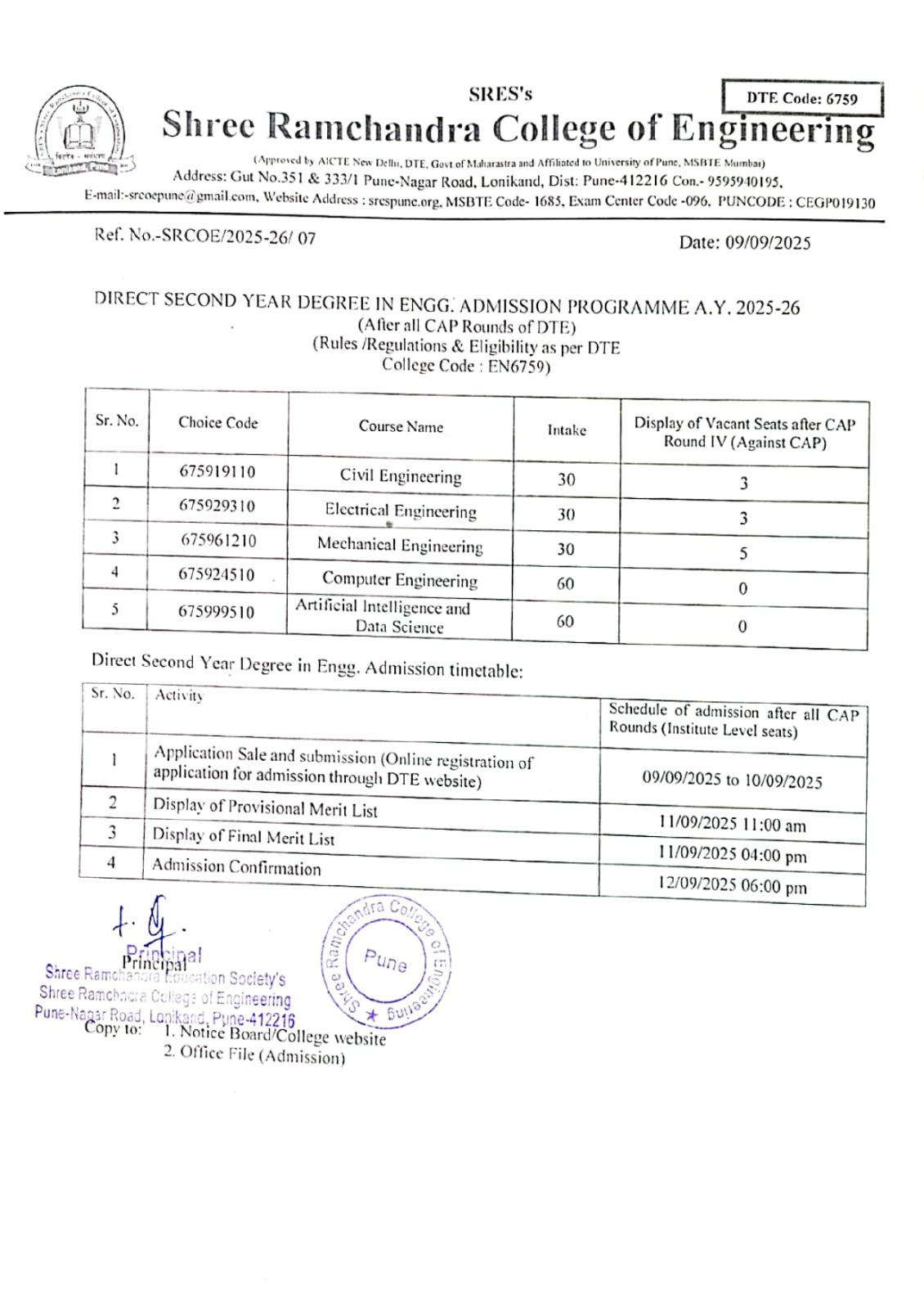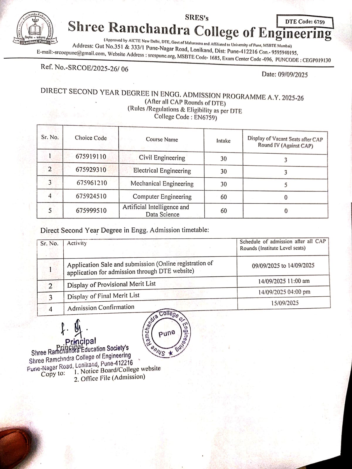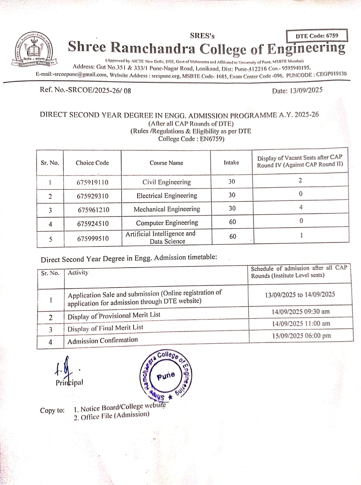 Direst Second year Diploma (Institute Level And Against Cap admission Schedule)